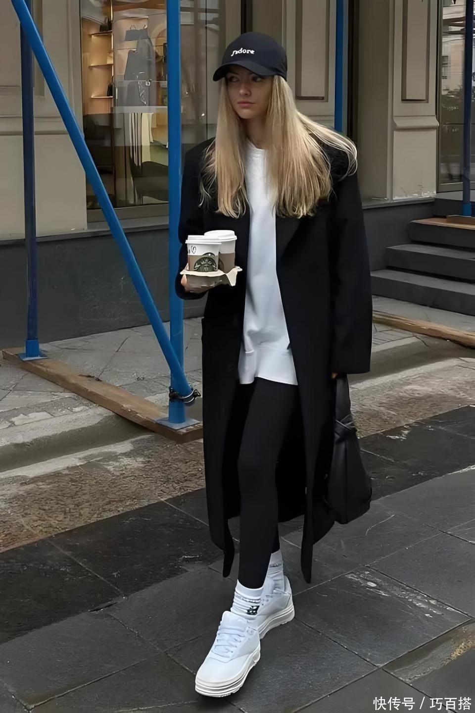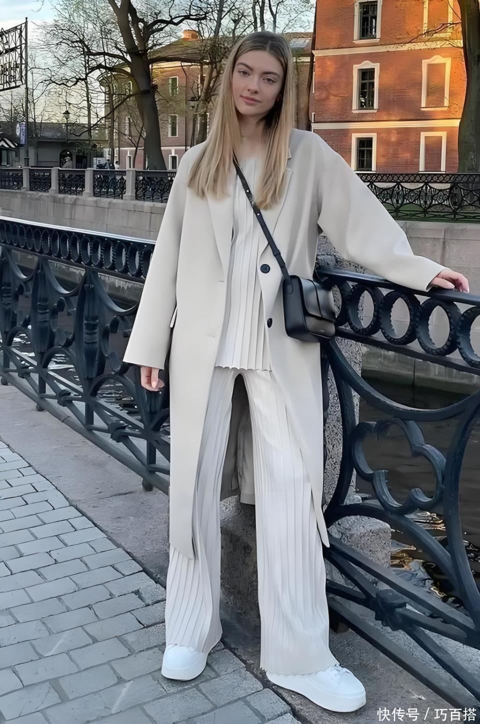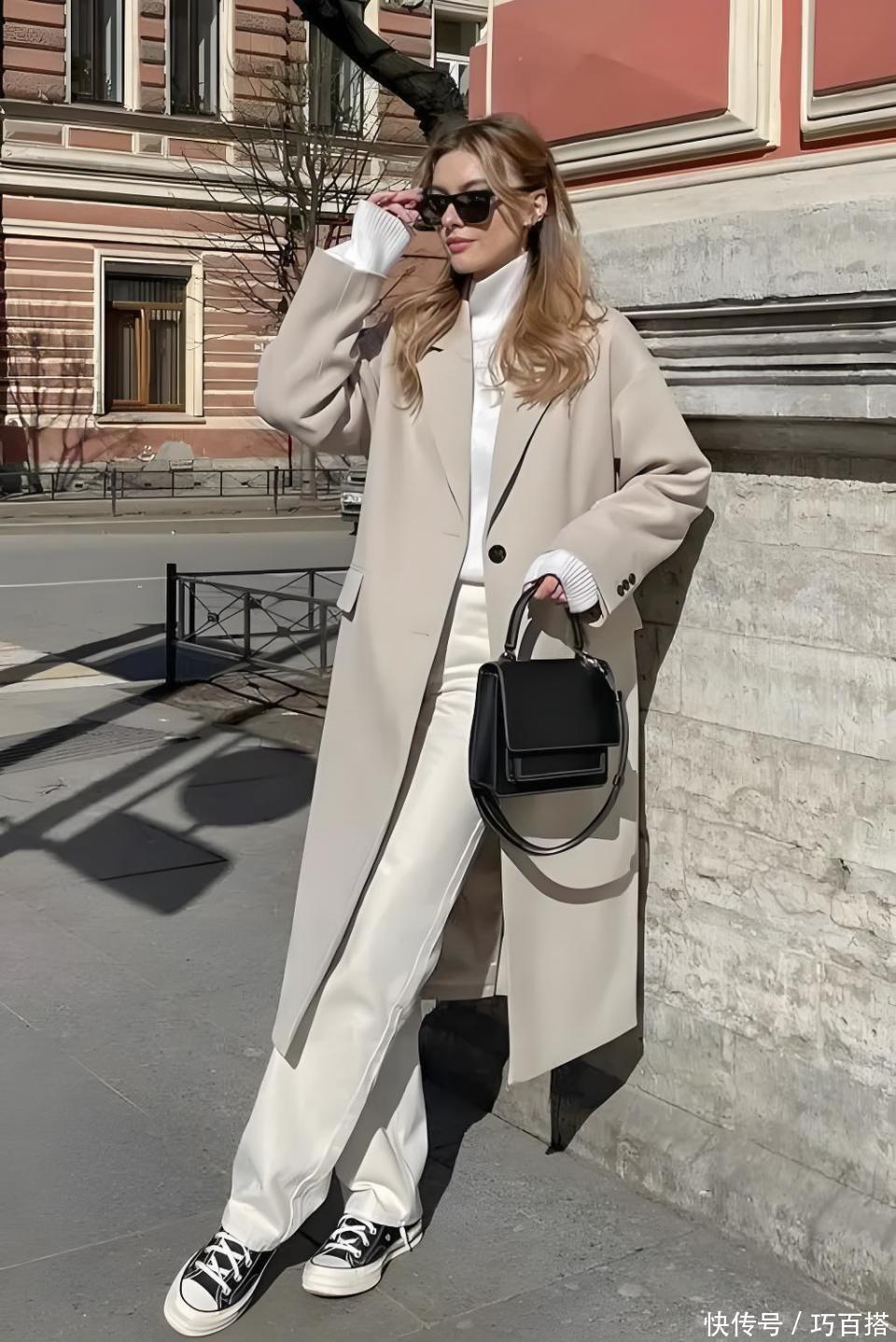 毛呢大衣+休闲鞋的组合,没有任何限制,愿意选择同色系搭配的姐妹,可以选择同色系穿法,无所谓单品配色的姐妹,选择不同色也能穿出时髦氛围。